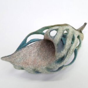 In this workshop you are going to create fascinating spiraling structures resembling sea shell skeletons. With a couple of resists we will prepare hollow chambers inside the felt and after having prefelted the material to fairly good stability, these cavities can be opened and unfolded into three-dimensional structures. We’ll take a close look at suitable types of wool, layering and fiber direction to prepare a durable pre-felt that can withstand cutting and reshaping to create sculptural forms. With further felting, 3d forms will be clearly modeled and compacted to their final, stable consistency.